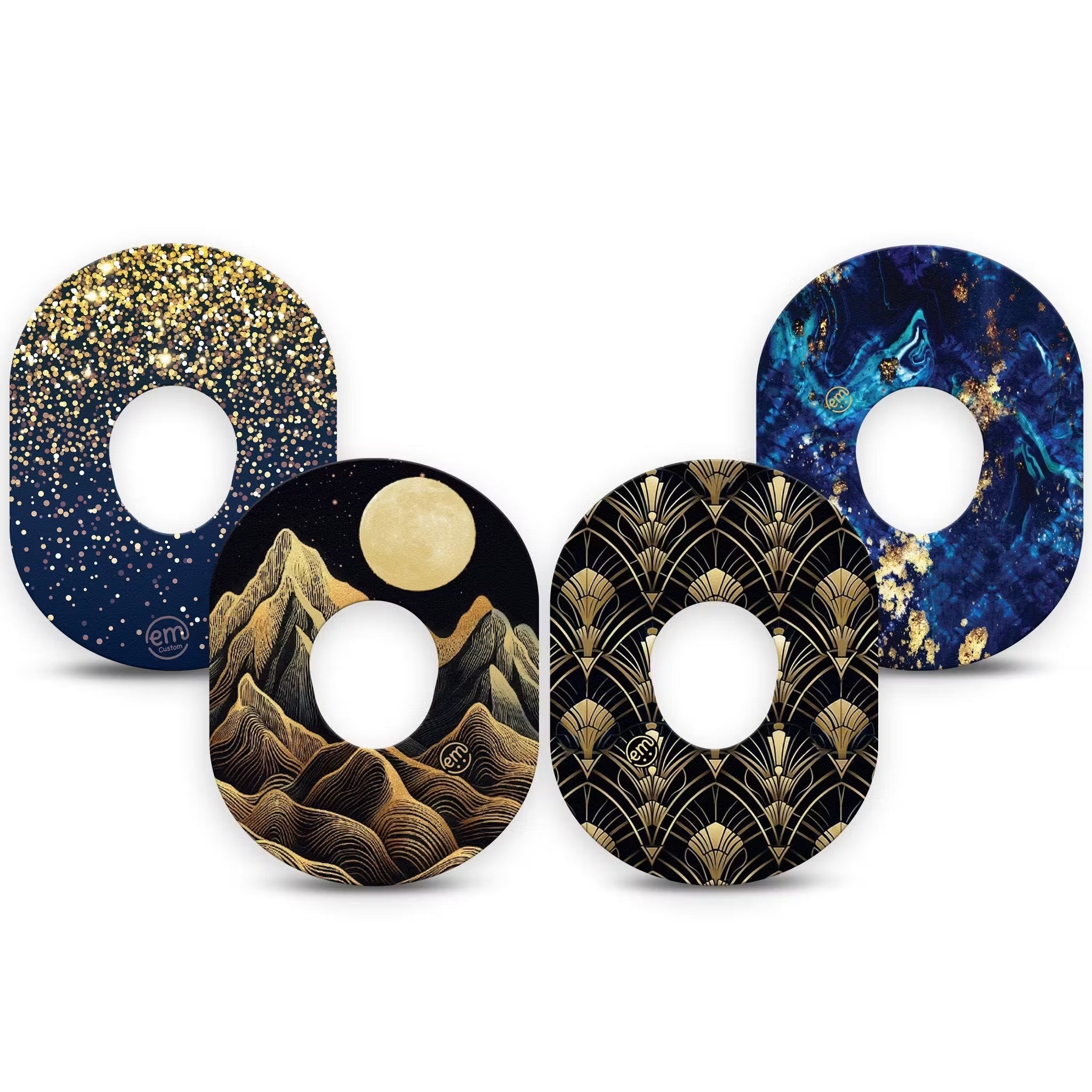 Pack contains one of each of our Black Mountain, Gold Sparkles, Molten Midnight and Midnight Deco design. Featuring our Dexcom G7 cut-out