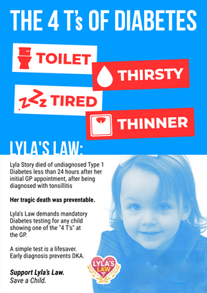 Lyla Story died of undiagnosed Type 1 Diabetes less than 24 hours after her initial GP appointment, after being diagnosed with tonsillitis. Her tragic death was preventable. A simple test IS a lifesaver.